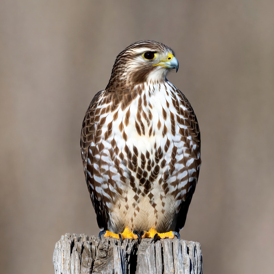 avian, bird, bird of prey, brown feathers, falconry bird, hawk, isolated background, juvenile hawk, nature, perched, raptor, streaked feathers, talons, white feathers, wildlife, wooden post, yellow beak, yellow eyes, red-tailed hawk