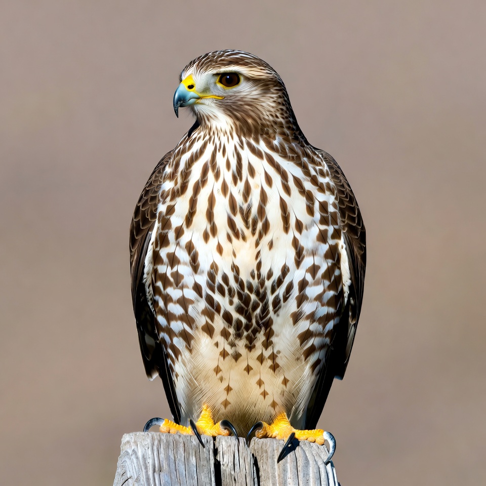 A red-tailed hawk with intricate brown and white striped feathers perches on a wooden post. It faces slightly to the side with sharp yellow eyes, a curved yellow beak, and yellow talons gripping the wood. The bird's breast shows detailed barring against a blurred neutral background.