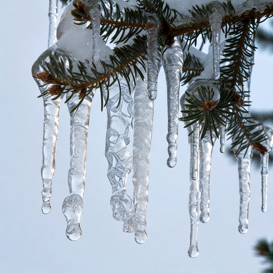 Icicles Hanging from Snowy Fir Branch
