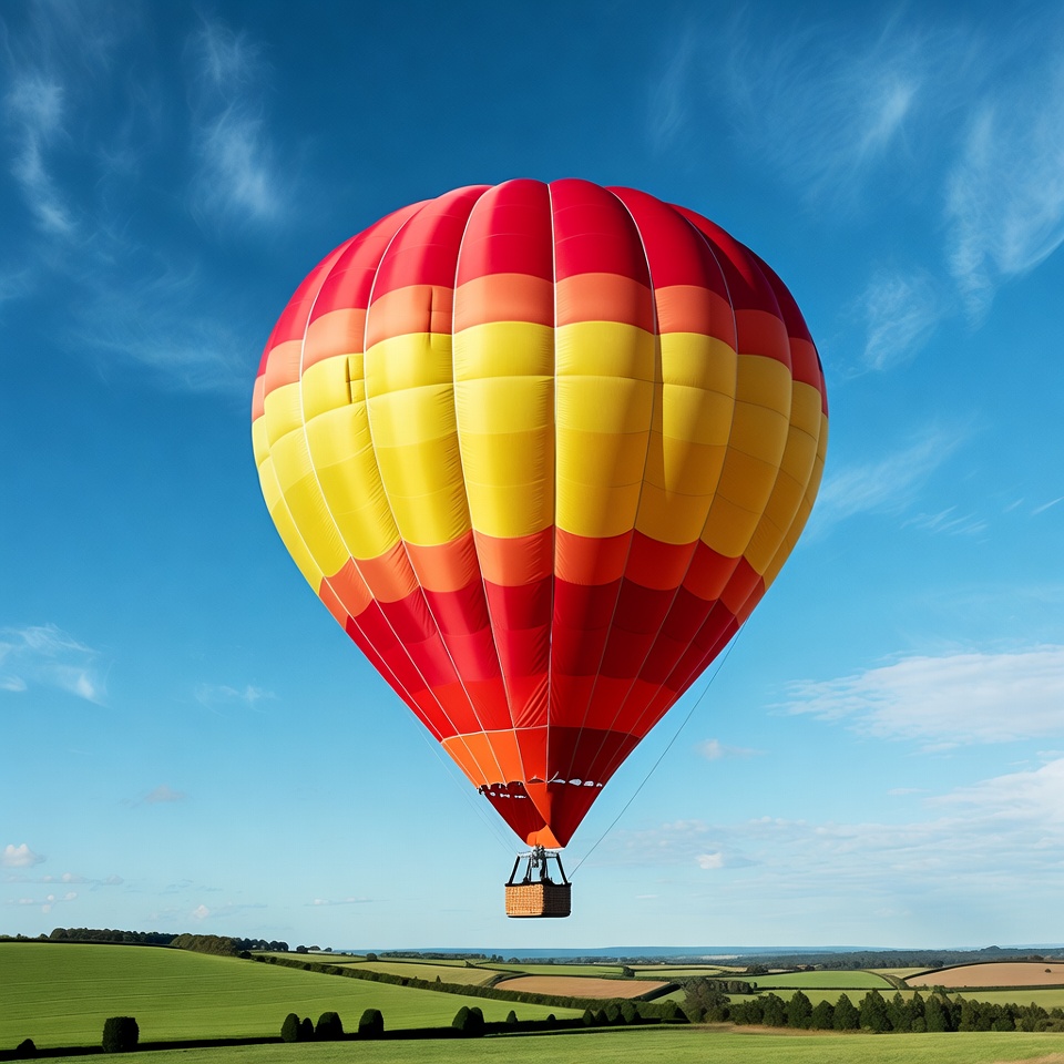 A large hot air balloon with red, orange, and yellow striped panels floats in a clear blue sky. The basket hangs below against a backdrop of rolling green hills and fields. The balloon is isolated on a bright, sunny day.