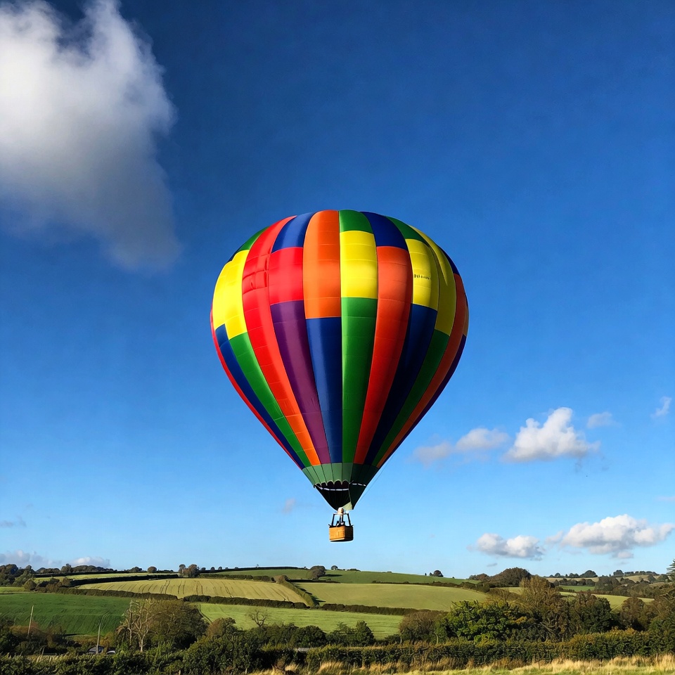 A vibrant hot air balloon with multicolored panels in red, yellow, green, blue, and purple floats in a clear blue sky with scattered white clouds. Below it stretches a landscape of green rolling fields and hills. The basket hangs from the balloon against the rural scenery.