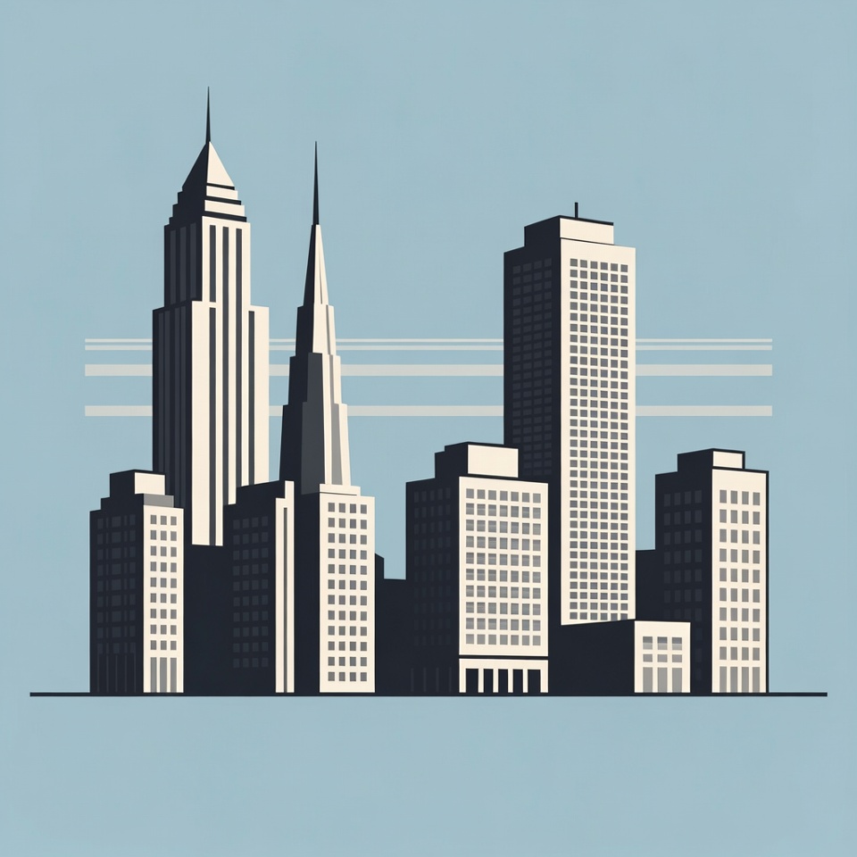 A minimalist flat illustration of a city skyline features tall skyscrapers and a church spire on a light blue background. The buildings are depicted in white and gray with black outlines and subtle striped accents. The design emphasizes sharp geometric shapes and an isolated background.