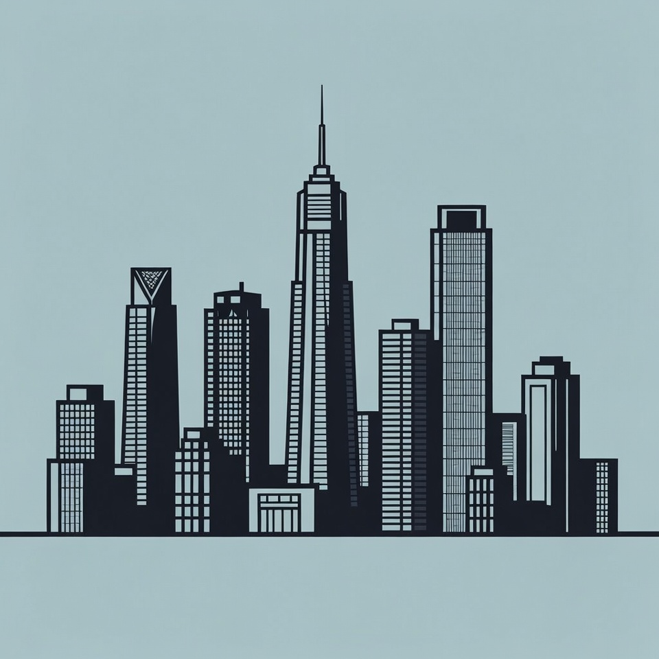 A black silhouette of the New York City skyline features tall skyscrapers including the Empire State Building against a light blue background. The illustration shows a row of modern high-rise buildings with detailed outlines. It is a simple vector graphic on an isolated background.