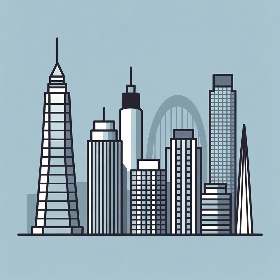 A minimalist line art illustration features iconic skyscrapers on a light blue background. Tall buildings include the Transamerica Pyramid, modern high-rises, the Gateway Arch, and the Shard. The vector-style skyline is outlined in black with subtle shading.