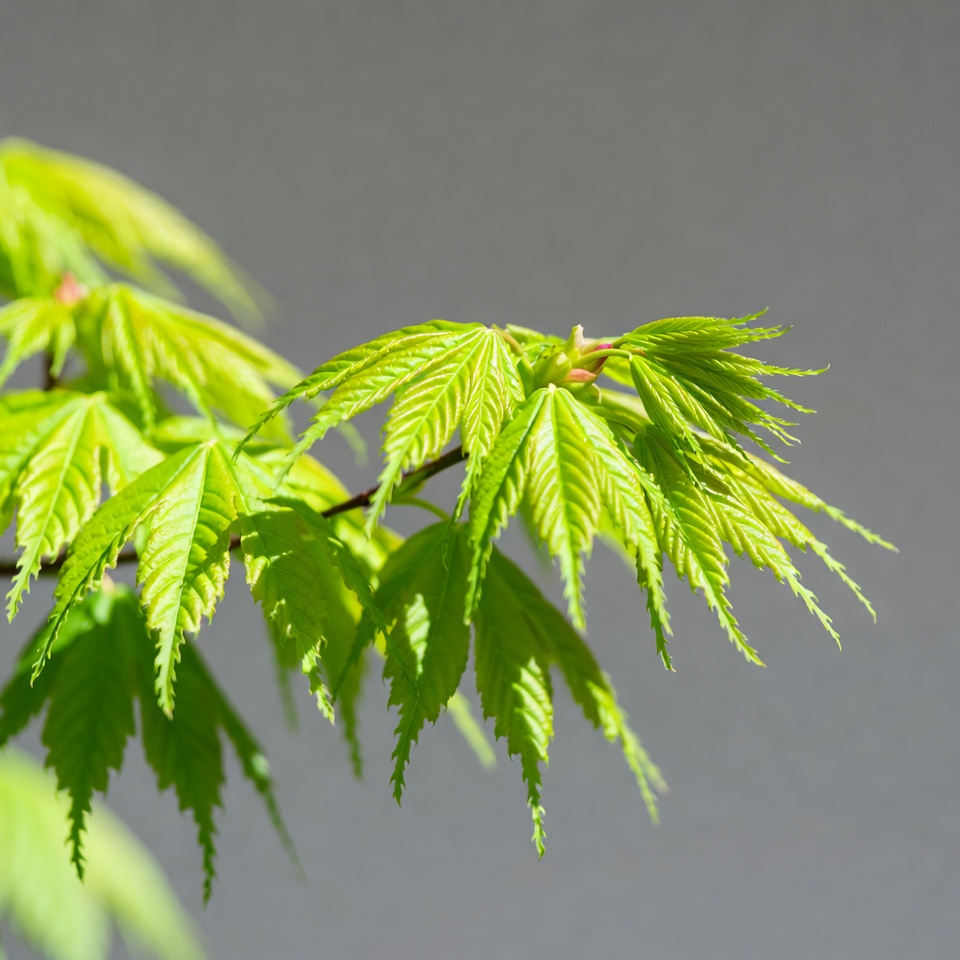 close-up, foliage, green leaves, isolated background, leaves, maple leaves, nature, new buds, plant, serrated leaves, spring leaves, tree branch, vibrant green, Japanese maple