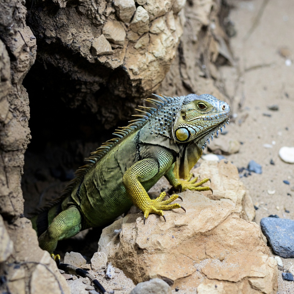 animal, cave, emerging, green iguana, isolated background, lizard, peeking, reptile, rocks, rocky cave, sand, scales, shells, spiky crest, wildlife, yellow legs, iguana