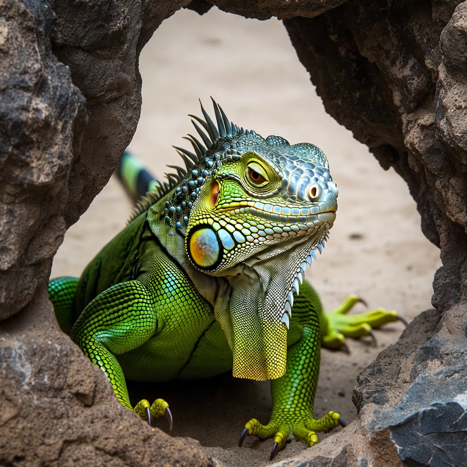 A vibrant green iguana with spiky crest and yellow stripes peers through a jagged hole in dark volcanic rock. Its head and front legs emerge prominently, showcasing detailed scales and intense yellow eyes. The background features sandy ground and blurred rock formations.