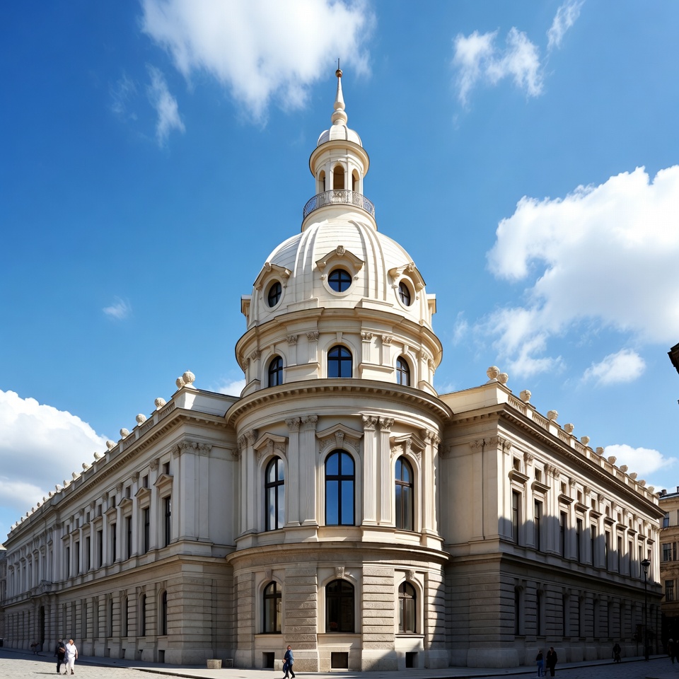 A large white neoclassical building with a prominent dome and spire stands on a cobblestone street under a blue sky with scattered clouds. The architecture features ornate cornices, arched windows, and corner pavilions. Two distant people in light clothing walk nearby.