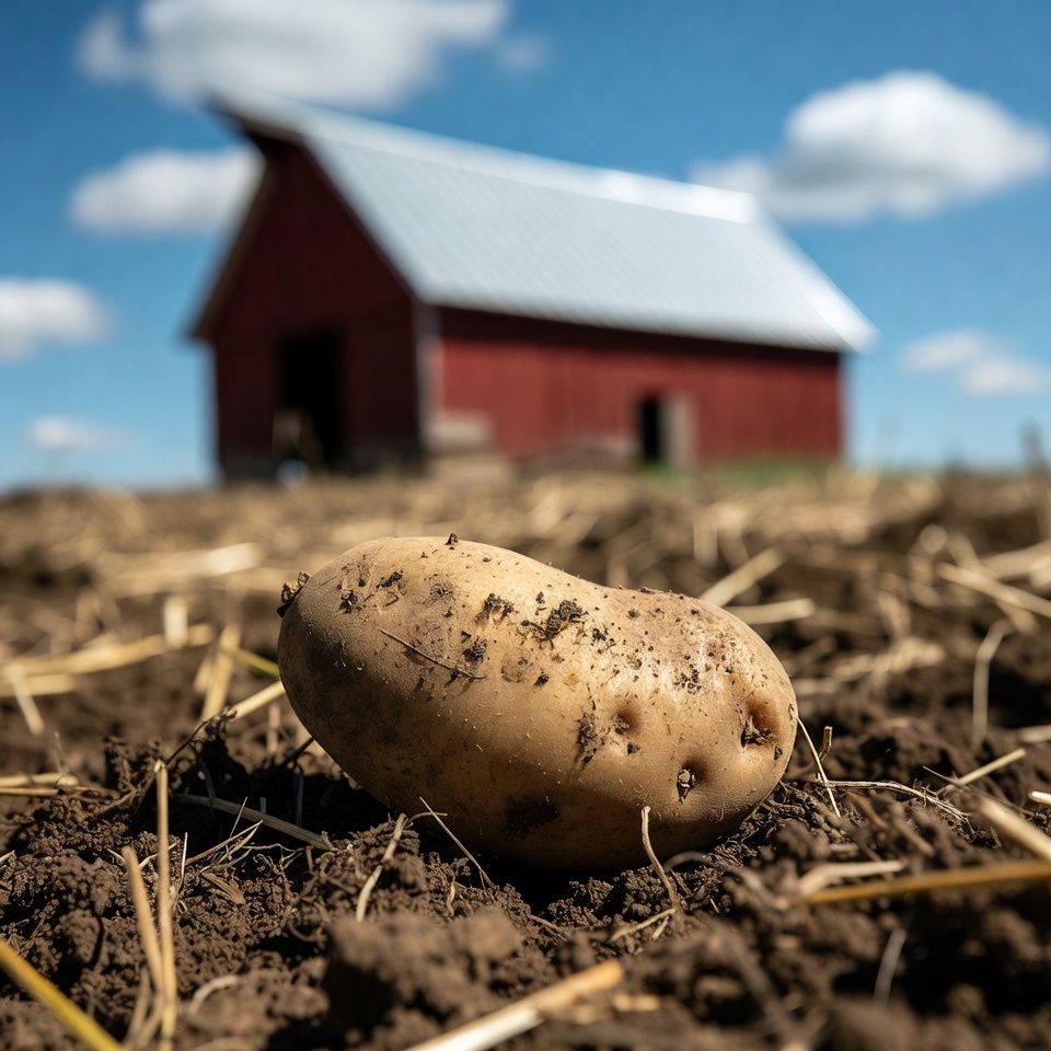 A single dirty potato sits on the soil amidst straw in a farm field. A classic red barn with a silver roof stands in the background under a blue sky with white clouds. The scene captures rural farmland with earthy tones.