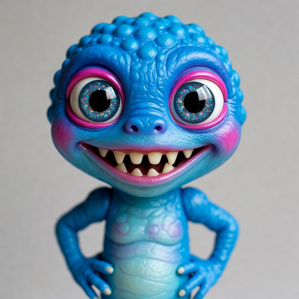 A cute blue monster figurine with bumpy textured skin and large sparkling eyes stands confidently with hands on hips. It features a wide grinning mouth with sharp white teeth, pink cheeks, and purple accents around the eyes. The figure is posed against a plain gray background.