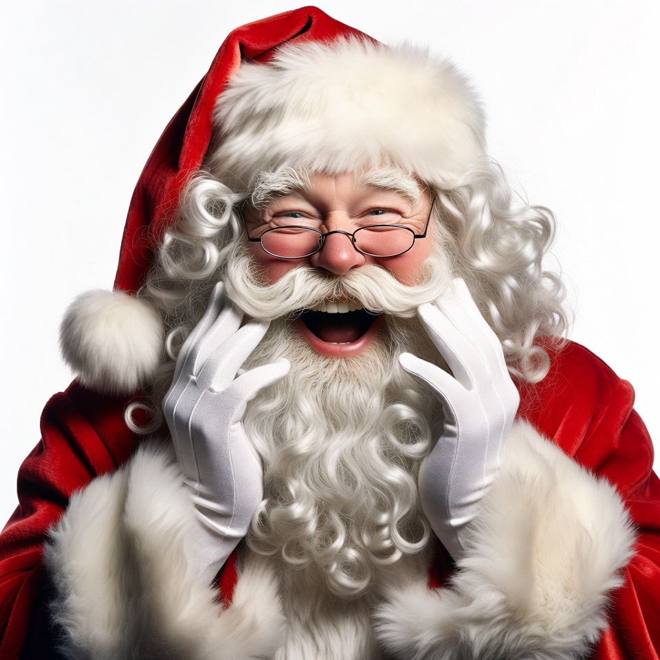 A jolly Santa Claus with long white curly hair and beard smiles widely while wearing round glasses. He has a red Santa hat with white pom-pom and a red velvet suit with white fur trim. His white-gloved hands are raised near his laughing mouth against a white background.
