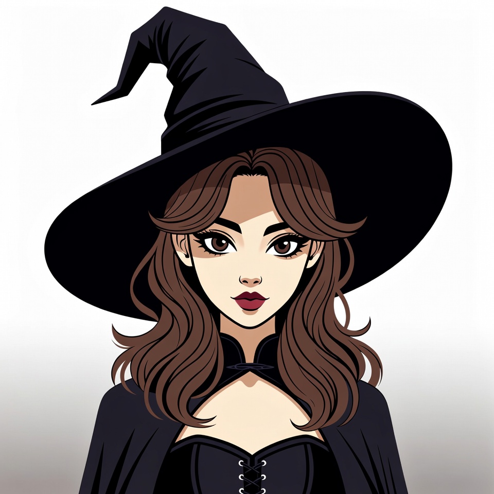 An anime-style illustration of a young woman dressed as a witch features a large black pointed hat and flowing brown hair. She wears a black corset with lace-up front and a cape over her shoulders. The character has a direct gaze with red lips, set against a white isolated background.