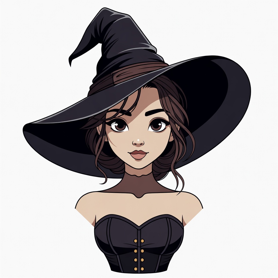 A cute cartoon illustration of a young woman dressed as a witch features a large black pointed hat and flowing brown hair. She has large expressive eyes and wears a black corset top with gold buttons. The portrait is set against a white isolated background.