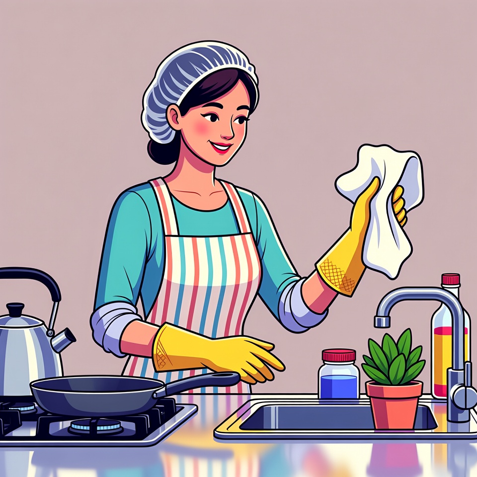 An Asian woman wearing a hairnet, striped apron, and yellow gloves cleans with a white cloth at the kitchen sink. She stands in front of a stove with a frying pan and kettle, surrounded by bottles, a potted plant, and cleaning supplies. The vibrant illustration features a clean, isolated background.