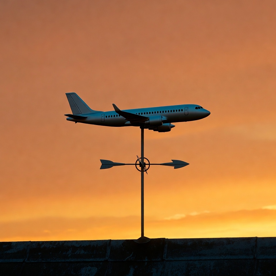 aircraft, aviation, directional arrows, dusk, isolated background, model plane, orange sky, outdoor, pole, silhouette, sky, sunset, weather vane, wind vane, airplane
