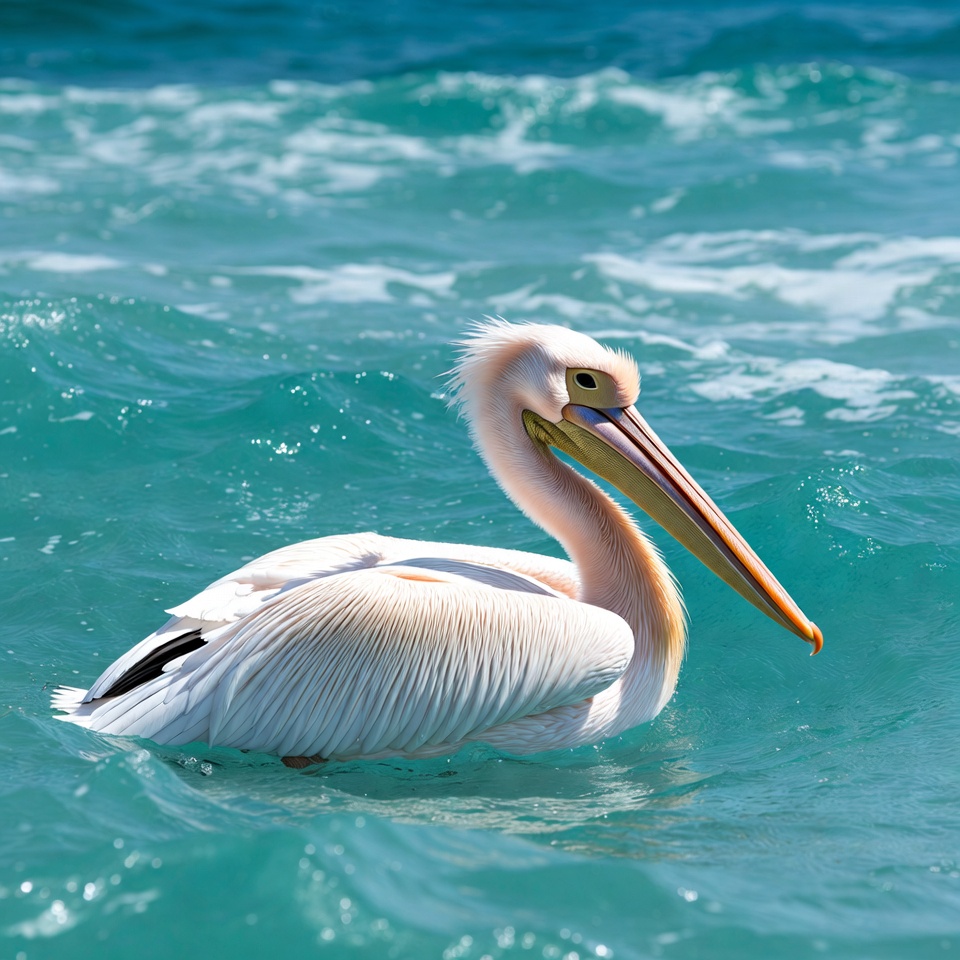 animal, bird, feathers, marine bird, nature, ocean, orange beak, pouch, sea, swimming, turquoise water, water bird, waves, white pelican, wildlife, pelican