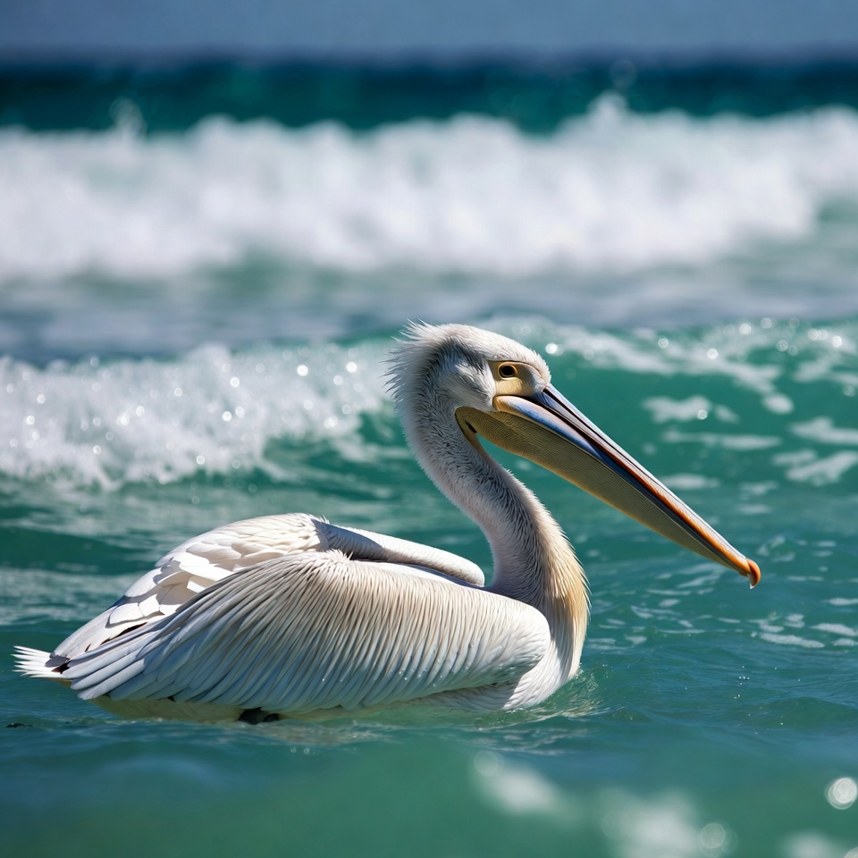 animal, beach, beak, bird, crest, feathers, marine bird, nature, ocean, sea, shorebird, swimming, turquoise water, water, waves, white pelican, wildlife, pelican
