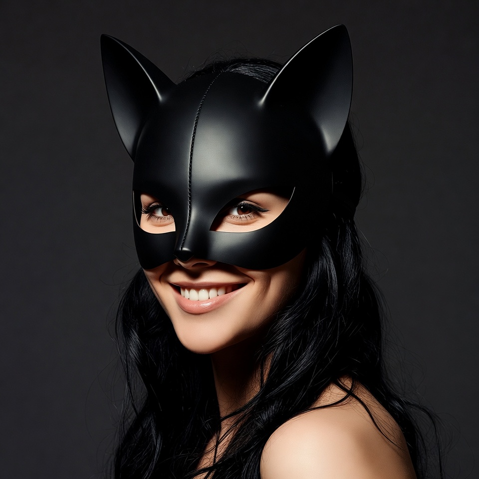 A woman with long black hair smiles while wearing a sleek black leather cat mask with pointed ears and eye slits. Her face is partially visible through the mask, showing bright eyes and lips. The image is set against a dark background, highlighting the mask's glossy texture.