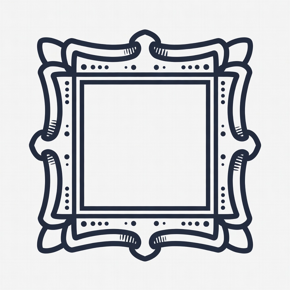 A detailed line art illustration of an ornate rectangular picture frame with intricate swirling edges and decorative dots. The frame features elaborate corner flourishes and a large empty white space in the center. It is rendered in thick black outlines on a transparent background.