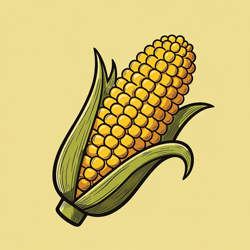 A vibrant hand-drawn illustration of a yellow corn cob with green husks. The corn kernels are detailed and shiny, arranged in neat rows. It is isolated on a light yellow background.