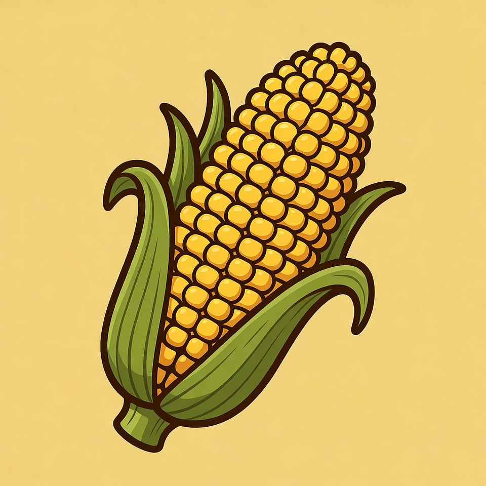 A vibrant cartoon illustration of a corn cob with yellow kernels and green husks. The corn is depicted on a light yellow background with bold black outlines. The kernels are detailed in a dotted pattern.