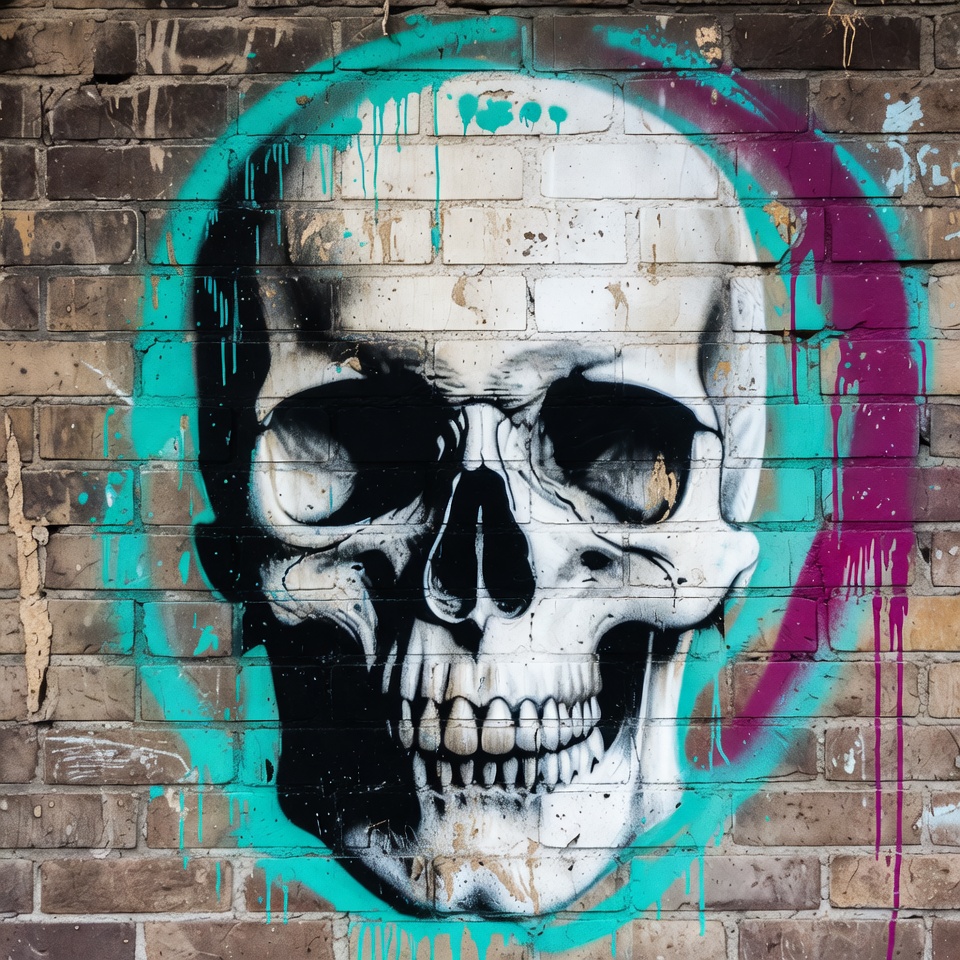black shadows, brick wall, circle outline, dripping paint, green paint, grinning skull, hollow eyes, paint drips, purple paint, skull, skull graffiti, spray paint, street art, teal circle, urban art, wall graffiti, weathered brick, white skull, graffiti skull