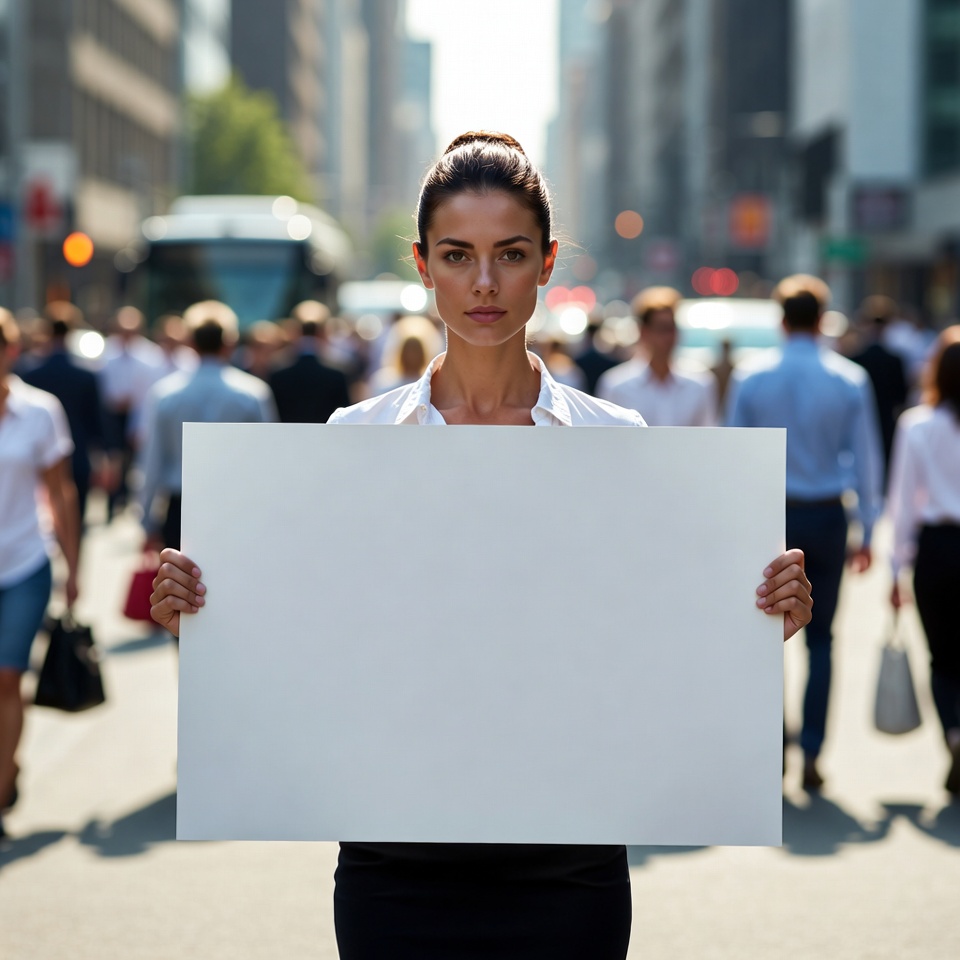 A young woman with dark hair in a bun stands in a busy urban street holding a large blank white sign. She wears a white blouse, black skirt, and red high heels, facing the camera confidently. Blurred crowds of business people and city traffic form a bustling background.