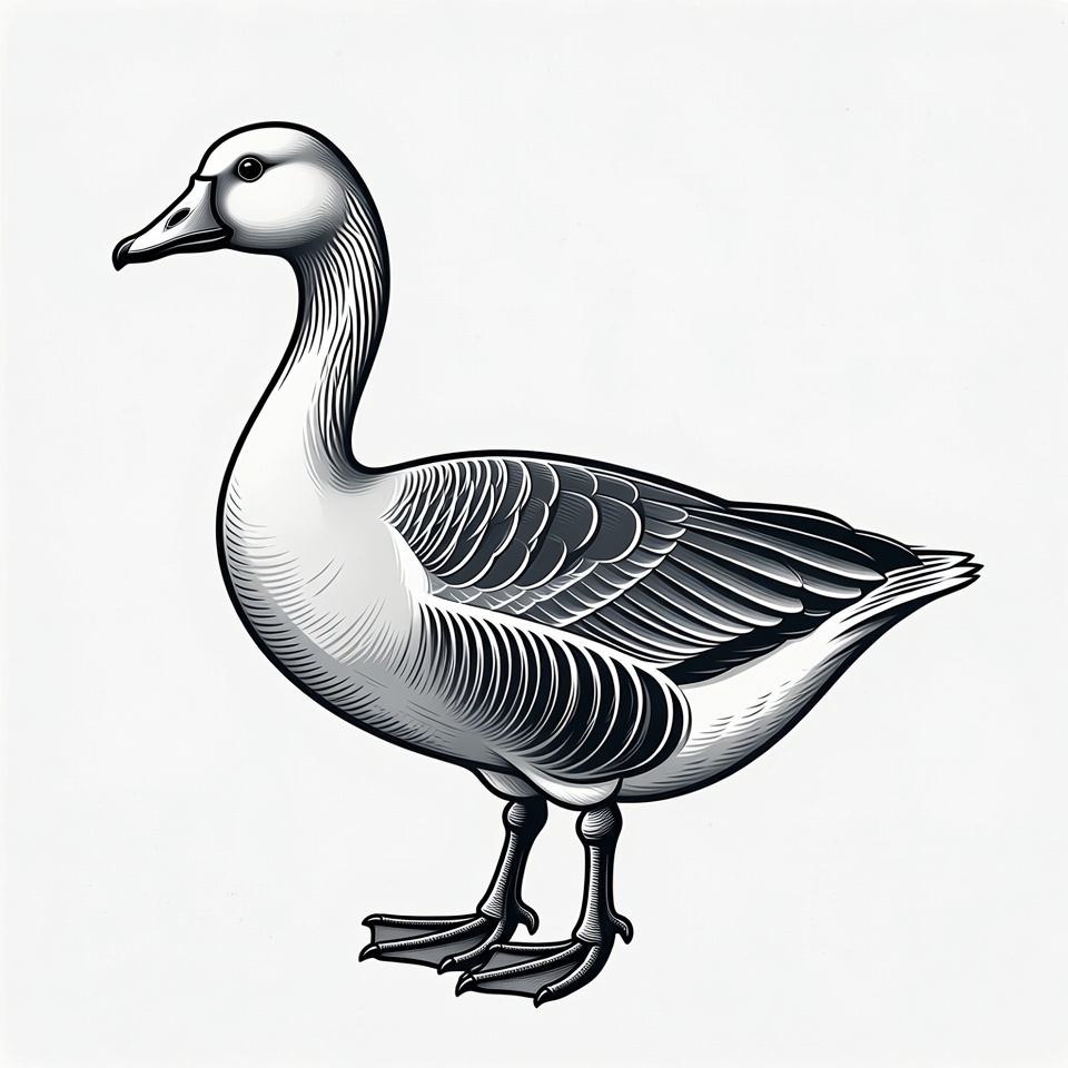 bird, black wings, clipart, detailed feathers, goose, illustration, isolated background, line art, pink beak, standing bird, vector illustration, waterfowl, white feathers, wildlife art, snow goose