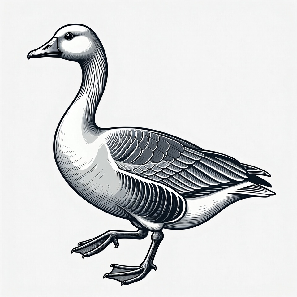 animal, bird, clipart, engraving style, feathers, goose, gray wings, illustration, isolated background, pink bill, standing bird, vector art, webbed feet, white goose, wildlife, snow goose
