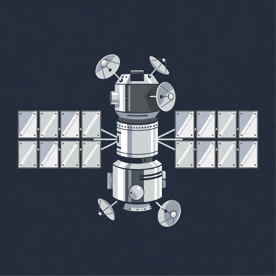 A detailed flat illustration of a space station on a dark blue background. The station features a central cylindrical module with multiple attached solar panels and satellite dishes. It has a metallic silver and gray color scheme with clean vector lines.