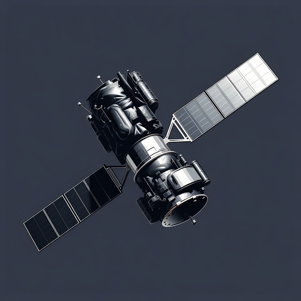 A detailed 3D rendered space satellite floats against a dark cosmic background. It features a central cylindrical body with extended solar panels on both sides and various antennas and modules attached. The satellite has a metallic gray finish with black paneling.