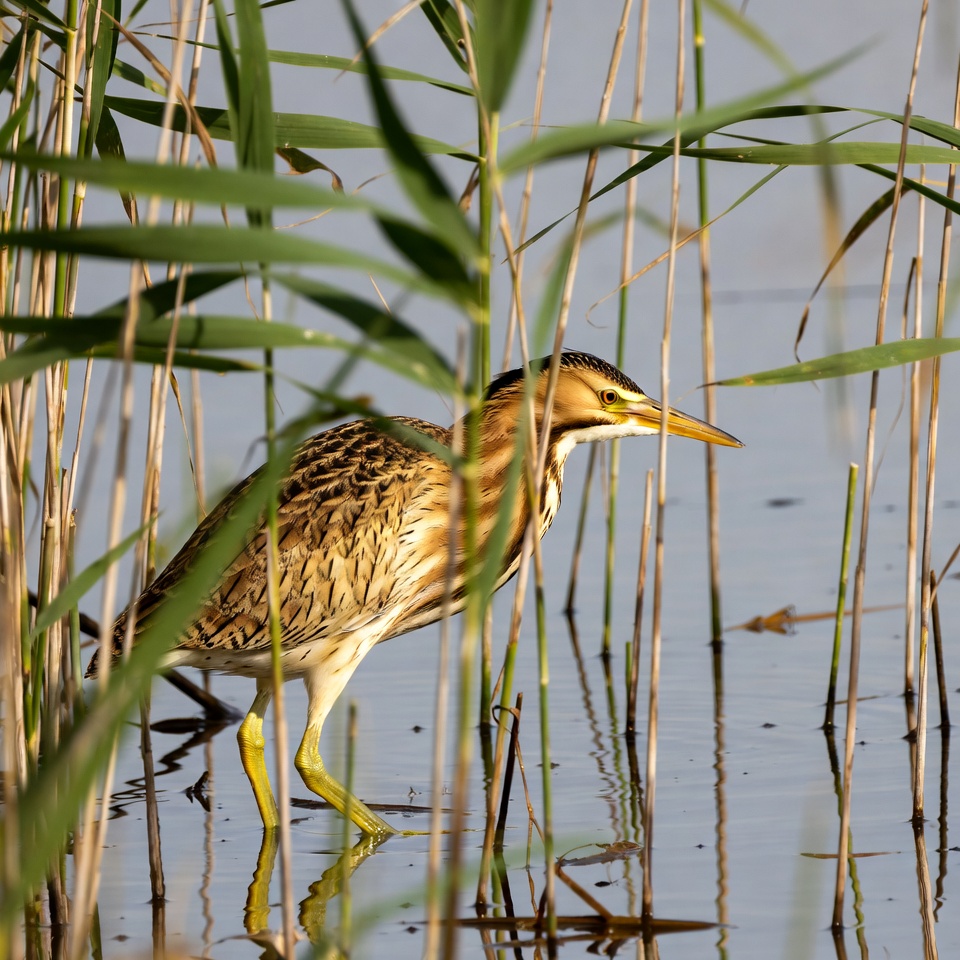 avian, bird, birdwatching, feathers, green reeds, heron-like, hidden bird, marsh, natural habitat, nature, reeds, shallow water, streaked feathers, wading bird, water bird, wetland, wildlife, yellow bill, yellow legs, bittern