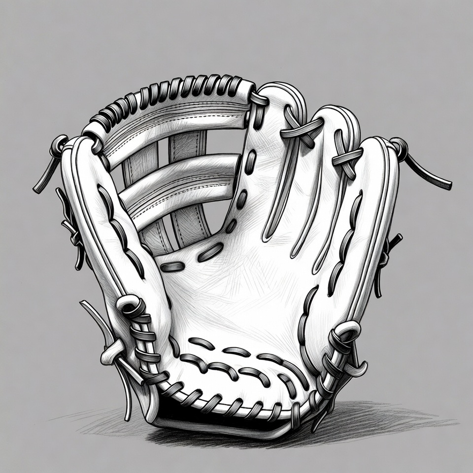 A detailed line drawing of a white baseball catcher's mitt is shown on a gray background. The glove features intricate stitching, laces, and webbing, rendered in a realistic sketch style. It is positioned open, ready to catch a ball.
