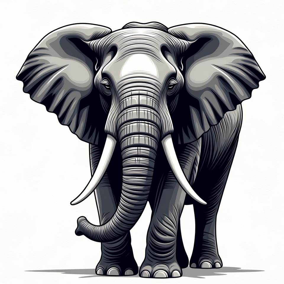 African elephant, animal, animal portrait, bold lines, clipart, detailed drawing, gray elephant, illustration, isolated background, large ears, mammal, nature, realistic illustration, safari animal, shaded art, standing elephant, trunk, tusks, vector art, white background, wildlife, elephant