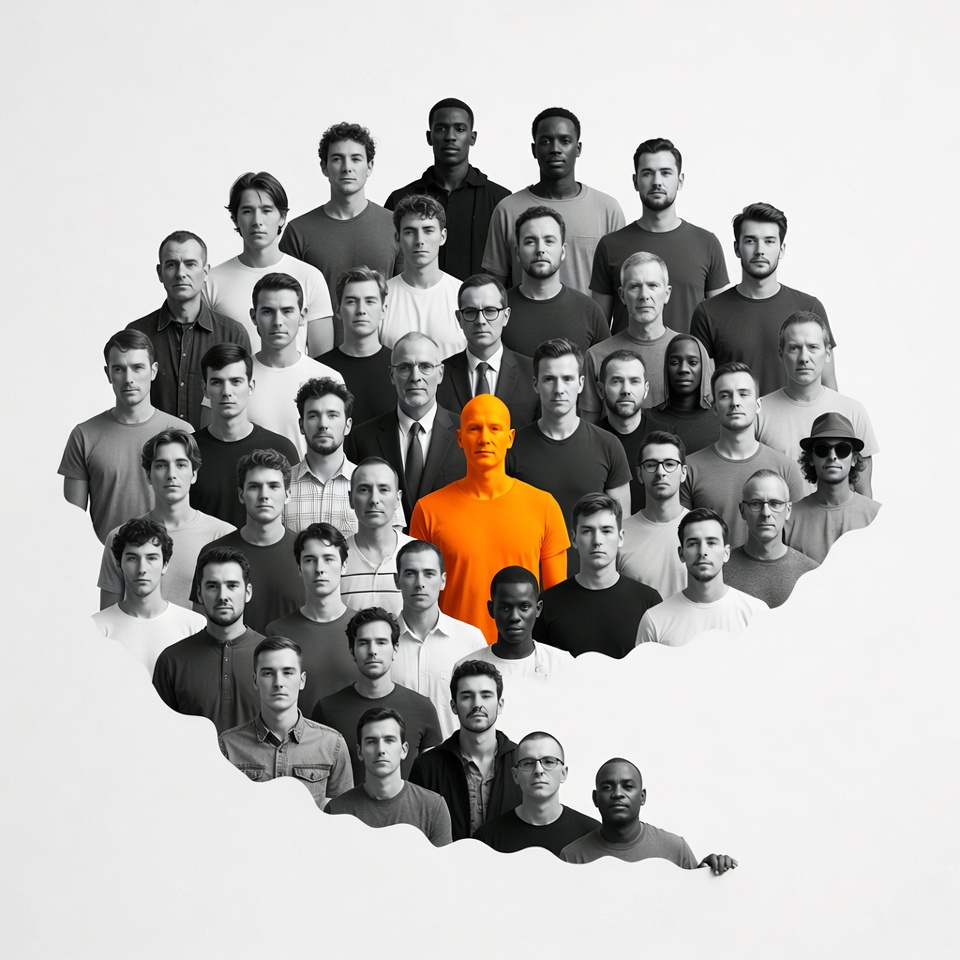 A large group of diverse men in casual shirts forms a circular crowd in black and white tones against a white background. One central man stands out prominently in a bright orange shirt. The composition emphasizes contrast and individuality within the group.