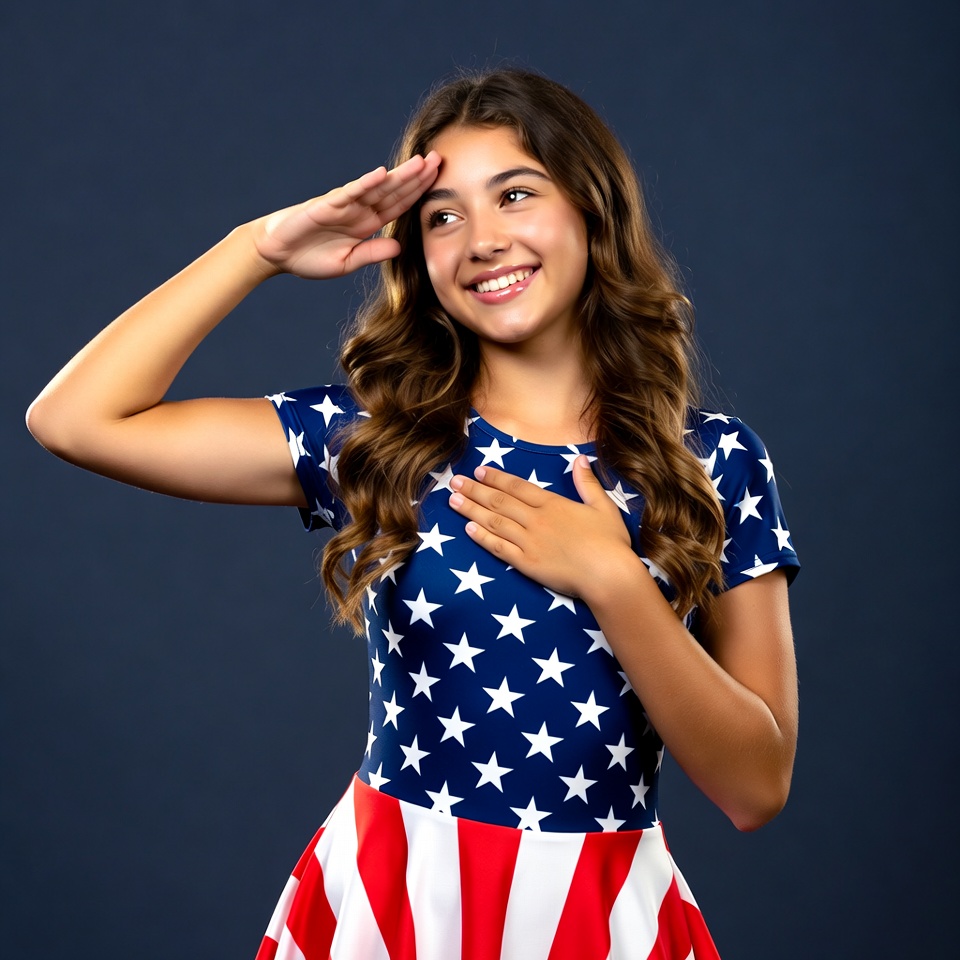 American flag dress, Fourth of July, Independence Day, White, blue background, brown hair, cute girl, female, hand on heart, happy girl, patriotic dress, patriotic girl, portrait, salute gesture, saluting, short dress, sleeveless, smiling, stars and stripes, teenager, wavy hair, young girl, girl