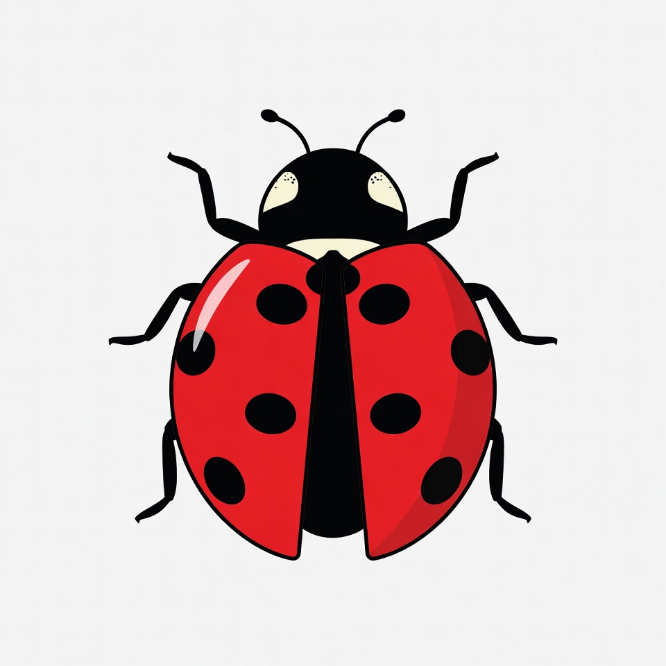 antennae, beetle, black spots, bug drawing, cartoon bug, clipart, cute insect, insect, isolated background, ladybug illustration, legs, nature graphic, red insect, red ladybug, shiny shell, simple illustration, spotted beetle, vector graphic, white eyes, ladybug