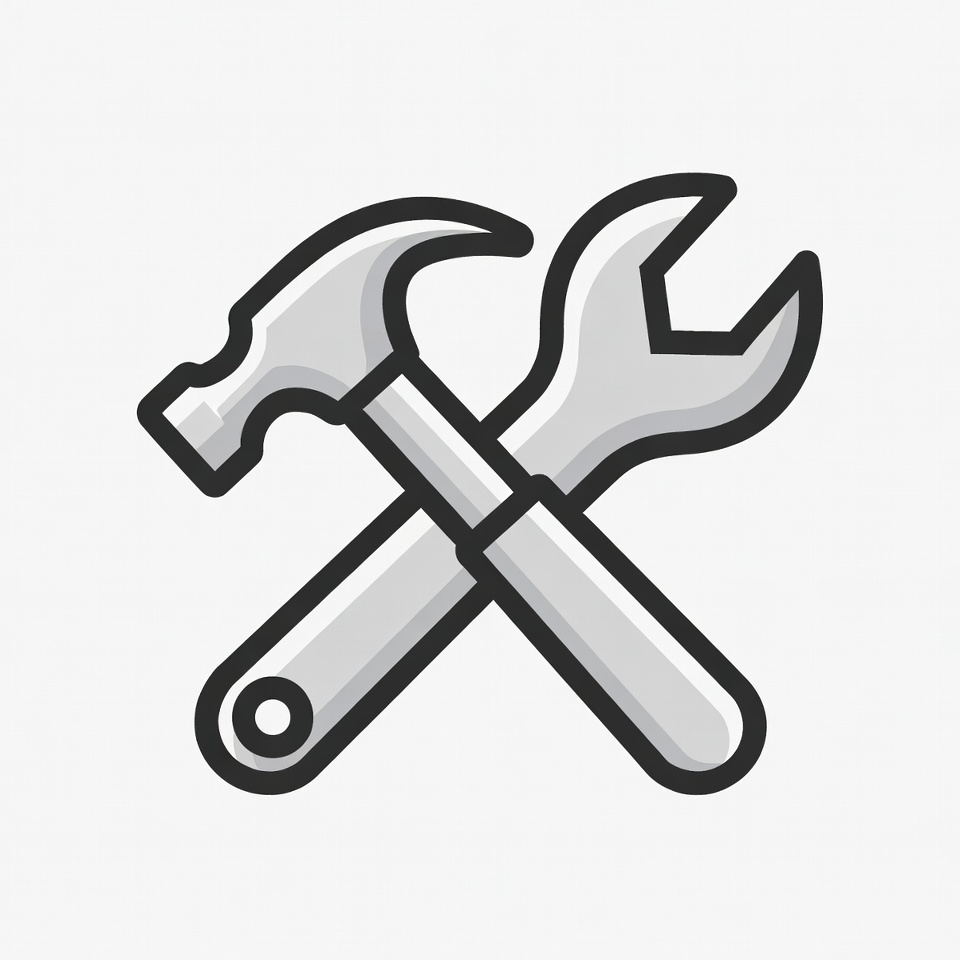A simple flat illustration features a silver hammer crossed with a silver wrench. Both tools have black outlines and are depicted in a clean, minimalist style on a transparent background. The hammer's head faces left while the wrench opens upward.