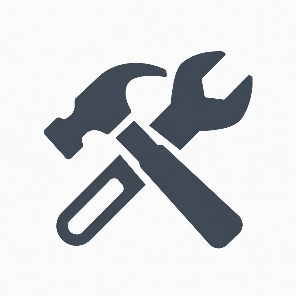 A simple black silhouette icon features a hammer crossed with a wrench. The tools are depicted in a flat design style on a transparent background. Both tools overlap at their handles, forming an X shape.