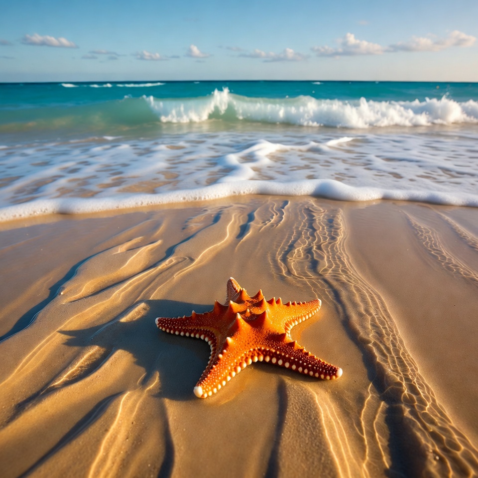 beach, blue sky, clouds, coast, isolated background, marine life, nature, ocean, orange starfish, sand, sea star, seashell, seaside, shoreline, summer, tropical beach, vacation, waves, wet sand, starfish