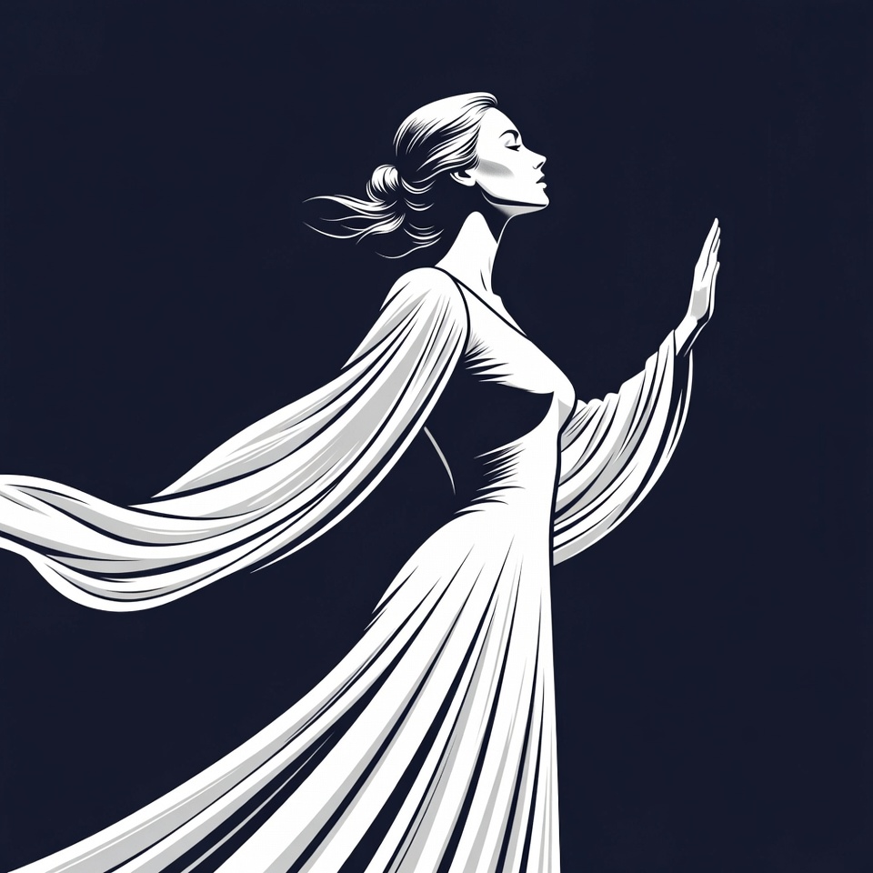 A stylized illustration of a woman in profile view against a dark background. She has long hair in a ponytail, wears a long white dress with flowing wide sleeves, and extends one hand gracefully forward. The artwork uses black and white line art with elegant, dynamic lines.