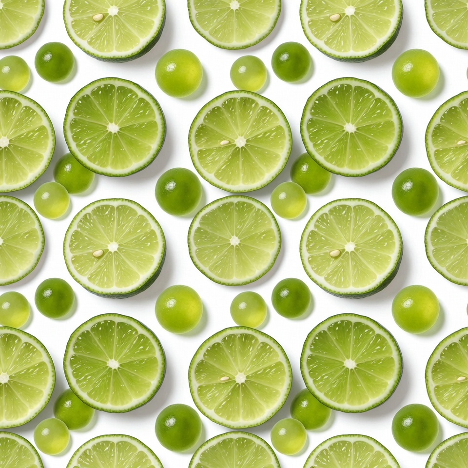 citrus fruit, food pattern, fresh fruit, fruit arrangement, fruit pattern, glossy grapes, grape clusters, green fruit, green grapes, green limes, juicy limes, lime halves, lime seeds, lime wedges, seamless pattern, white background, lime slices