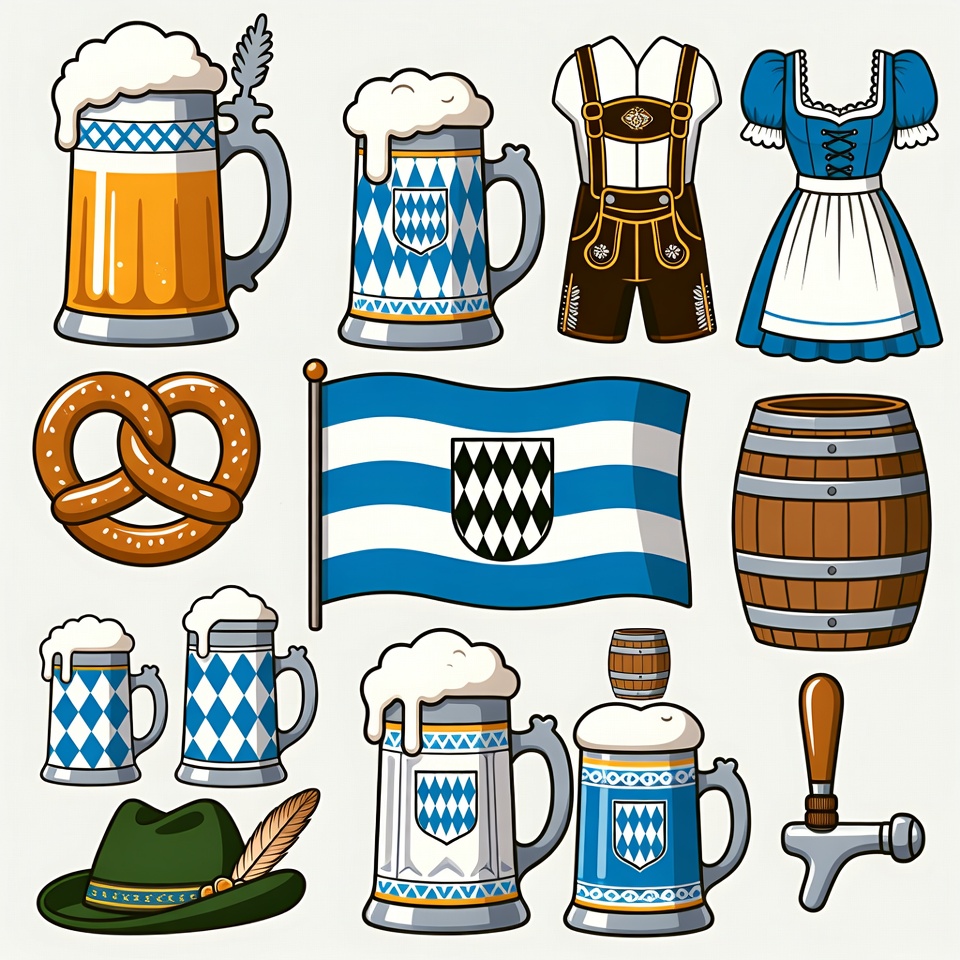 Bavaria flag, Bavarian, Germany, Munich, barrel, beer mug, beer stein, beer tap, blue white, clipart, dirndl, feather, festival, flag, foam, green hat, hat, illustration, isolated background, lederhosen, pretzel, traditional clothing, wooden barrel, Oktoberfest