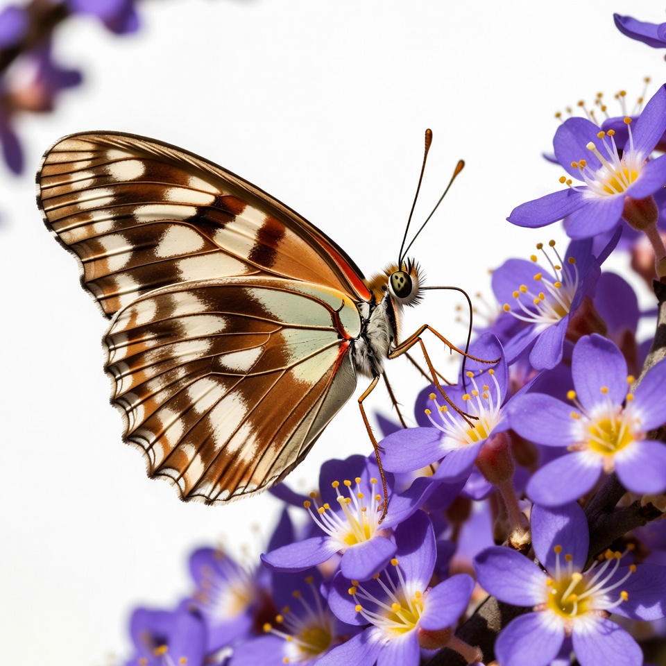 antennae, black markings, blooming flowers, brown edges, closeup, detailed wings, floral, flower cluster, insect, isolated background, macro photography, nature, orange accents, purple flowers, striped pattern, vibrant purple, white wings, wildlife, wings spread, butterfly