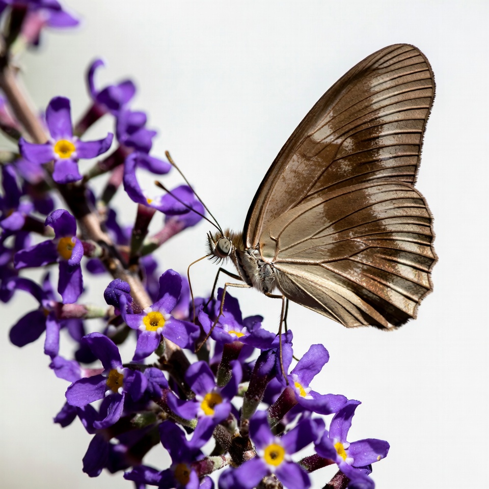 bloom, brown butterfly, bug, closeup, floral, flowers, insects, isolated background, lepidoptera, macro, nature, petals, pollinator, purple flowers, white background, wildlife, wings, butterfly