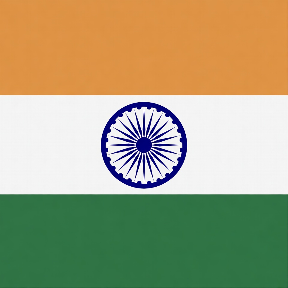 The flag of India features three horizontal stripes: saffron orange on top, white in the middle, and green on the bottom. Centered on the white stripe is a navy blue Ashoka Chakra wheel with 24 spokes. It is displayed on a plain background.
