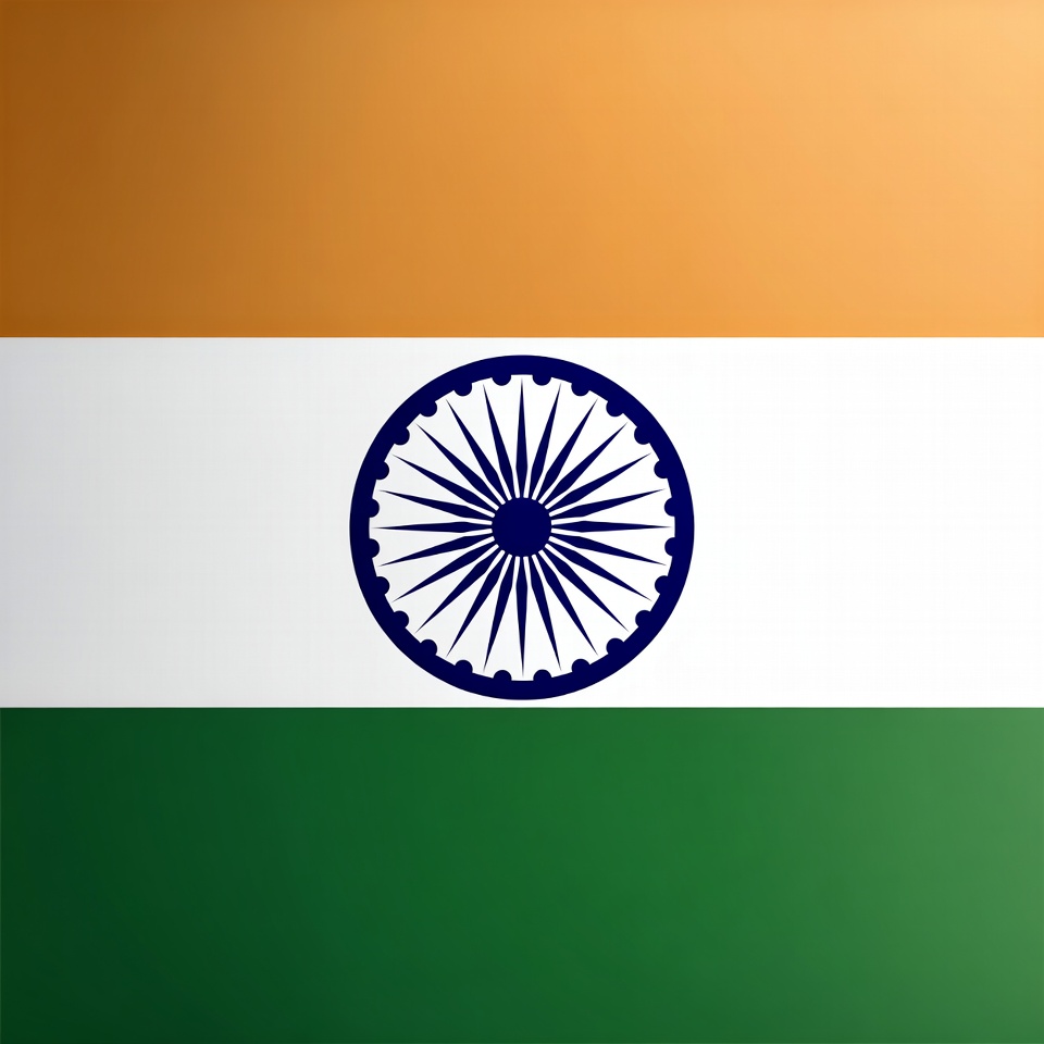 The flag of India features three horizontal stripes in saffron orange, white, and green. A navy blue Ashoka Chakra wheel with 24 spokes is centered on the white stripe. The design is simple and bold against a plain background.