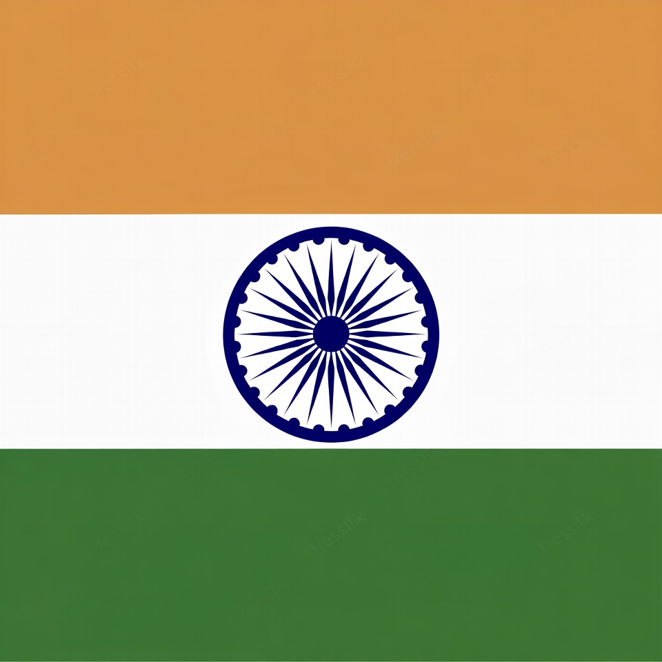 The flag of India features three horizontal stripes: saffron at the top, white in the middle, and green at the bottom. Centered on the white stripe is a navy blue Ashoka Chakra wheel with 24 spokes. It is a simple, bold design on an isolated background.