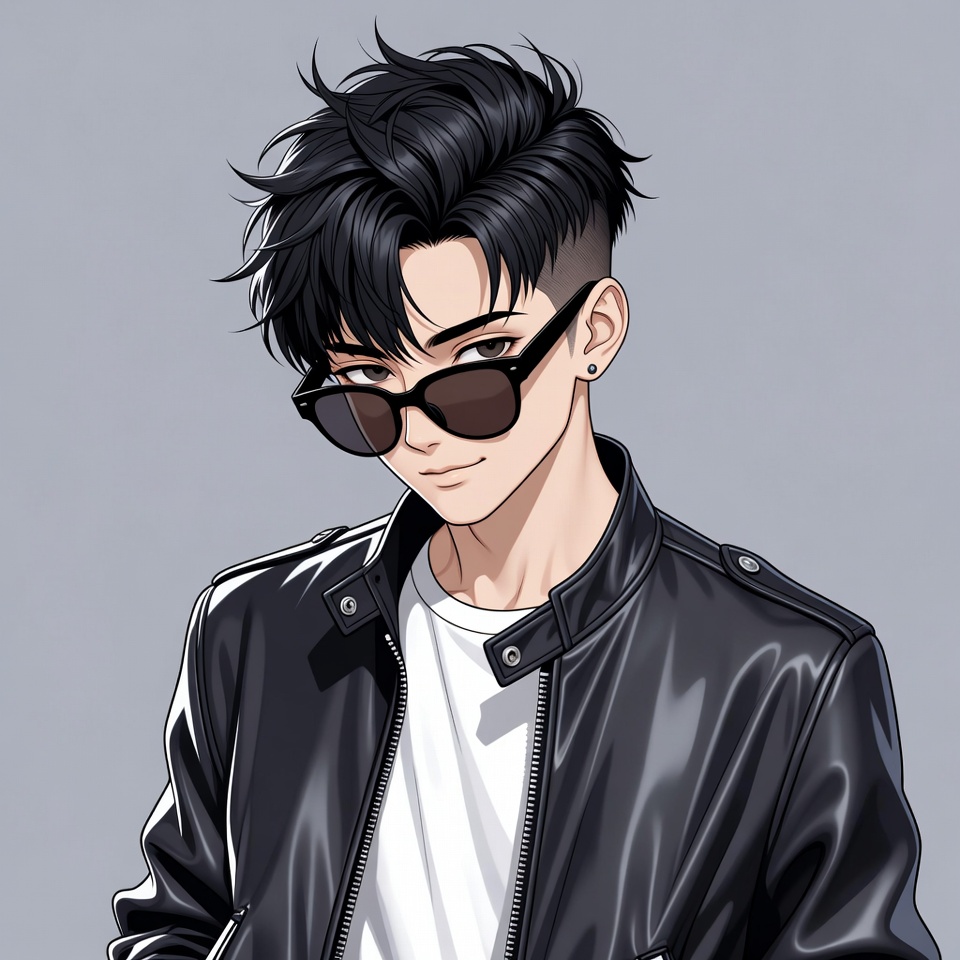Asian, black hair, black jacket, black sunglasses, cool guy, earring, illustration, isolated background, leather jacket, male, man, manga style, portrait, smiling, spiky hair, stylish man, sunglasses, undercut hairstyle, white t-shirt, young man, anime