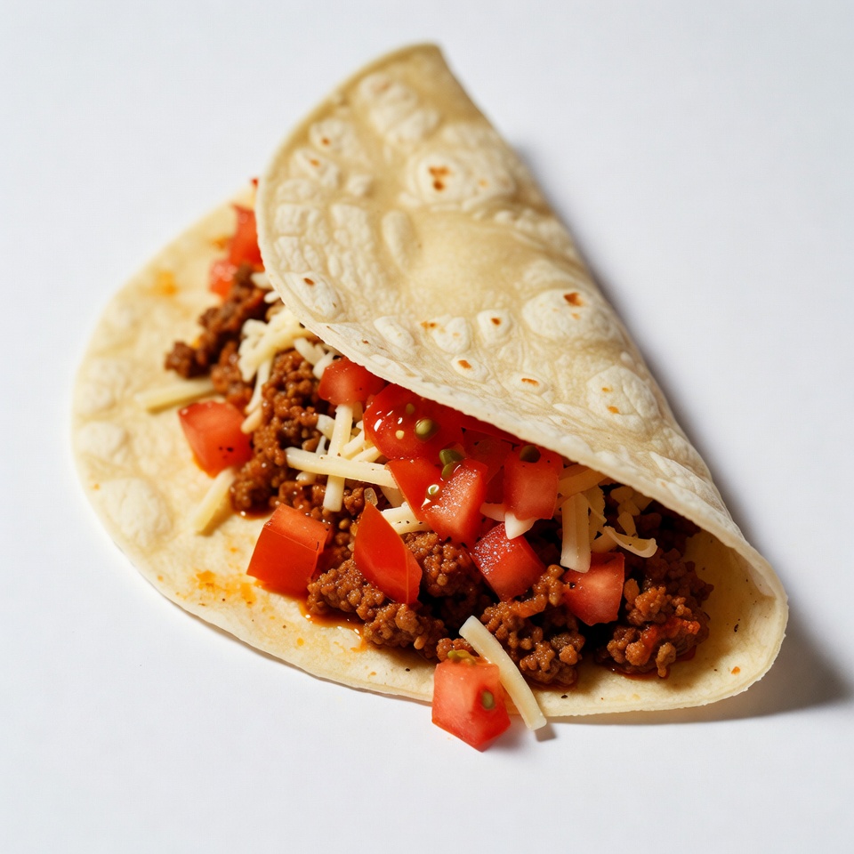 A soft flour tortilla is folded and filled with seasoned ground beef, shredded cheese, and diced tomatoes. Fresh tomato chunks and cheese are piled on top, with some spilling over the edge. The taco is presented on a plain white background.